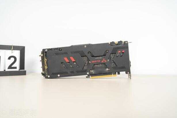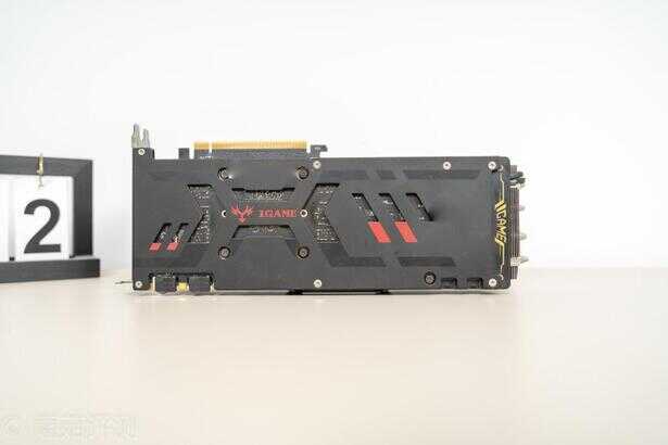 ▼显卡的背板整体是黑色的,上面点缀一些红色的元素,中间IGAME的LOGO,然后在核心和供电部分,背板上相应有一些开孔。和这张卡漂亮的正面相比,我感觉这张卡的背板就平淡无奇,造型也不漂亮,表面就是简单的喷砂,也没有漂亮的涂装,就感觉和显卡正面很不搭