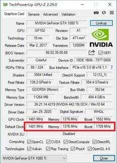 ▼另外,七彩虹这张卡还有一个超频模式,打开之后,GPU-Z里面可以看到Boost频率提高到了1709MHz