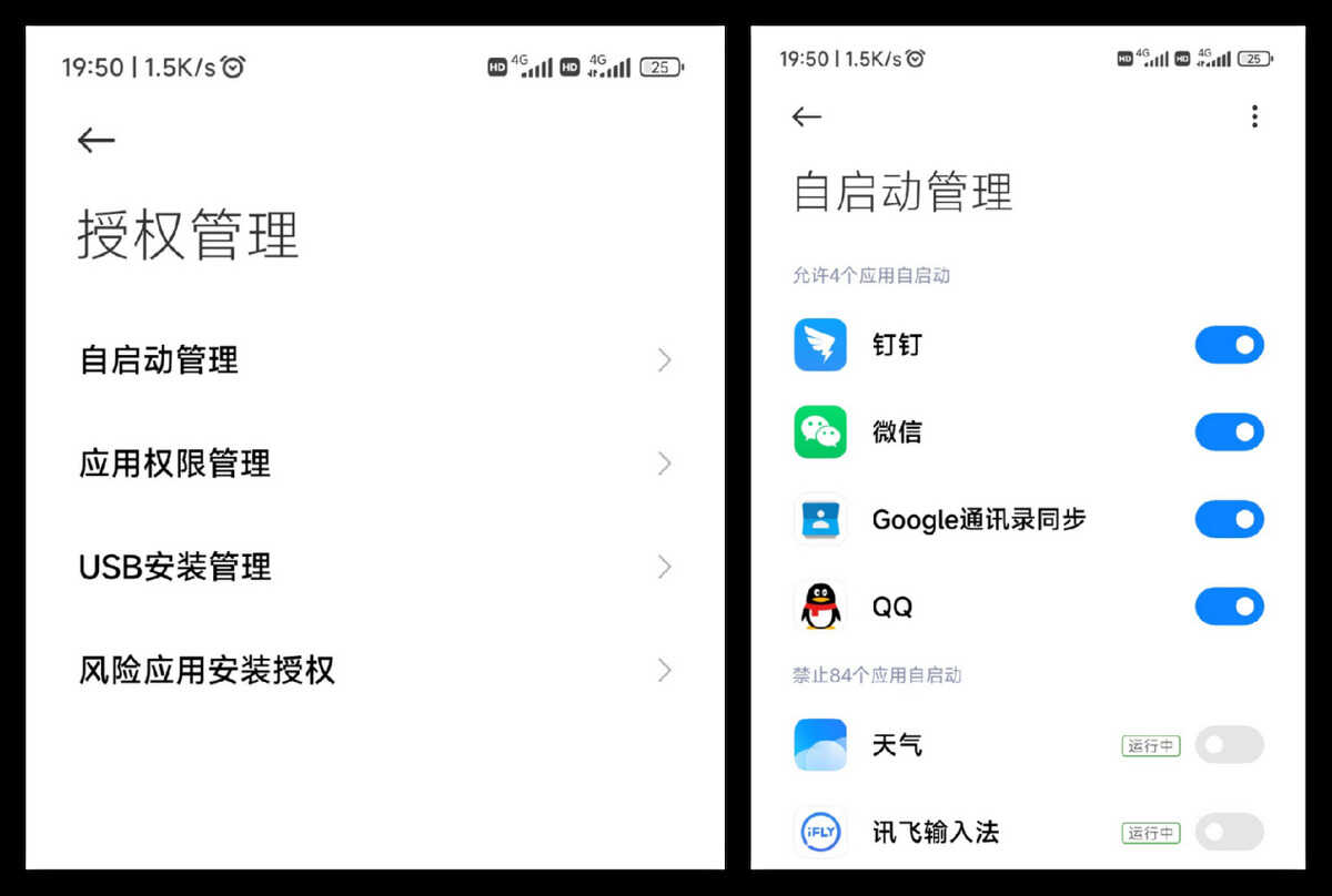 其实安卓系统的后台软件关闭流程都差不多,以小米为例,首先还是打开“设置”,然后找到“应用设置”,查看“授权管理”,找到“自启动管理”,把列表中不常用的软件全部关闭自启动,如果不需要及时回复信息,可以连社交软件也一并关掉。
