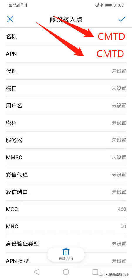 第六步:名称填入“CMTD”, 在APN输入“CMTD”,往下划选择保存退出