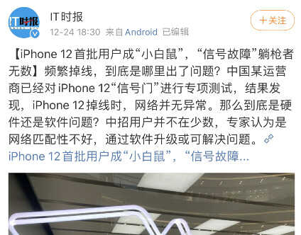 对于信号强弱,部分用户认为应该与当地基站有关,而关于这个问题,近日!中国IT时报发布了一篇关于 iPhone12 信号报道。