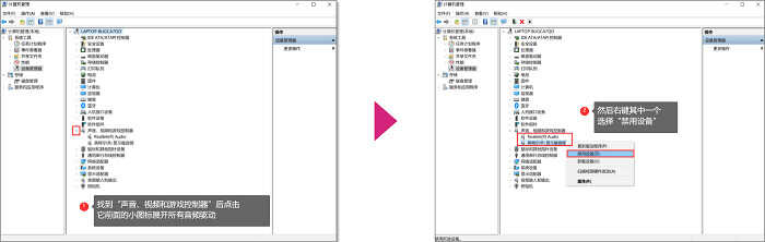 2. 在“设备管理器”找到“声音、视频和游戏控制器”,重新启动里面的音频驱动(原理类似电脑死机重新启动)。