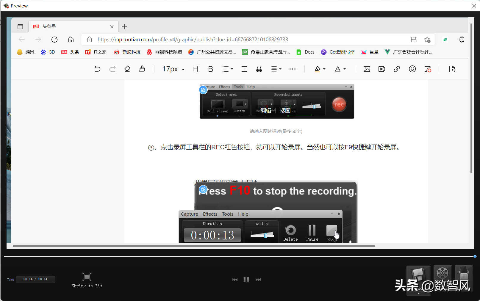 ④、但录屏完成后,可以按F10结束录屏,系统会自动进入视频预览界面。如果视频效果非常OK,那么我们就可以选择右下角的“produce”按钮,直接保存共享。如果觉得有点瑕疵需要编辑,这点击“save and edit”进入剪辑页面。如果觉得非常糟糕,则可以点击“delete”按钮键视频删除。