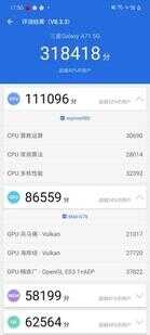 除5G外,手机性能同样是许多用户关注的焦点。此次三星A71 5G配备的Exynos 980芯片采用8nm制程工艺,首次采用ARM新一代Cortex-A77架构,也能够确保快速处理数据。安兔兔实测后318418分的总成绩,也反映出搭载Exynos 980的三星A71 5G足以满足日常的使用需求。