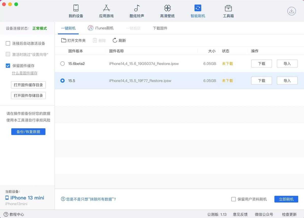 备份成功之后,把下方的「常规快速刷机」勾选上,在勾选已经下载iOS 15.5 固件版本,最后点击「立即刷机」即可。