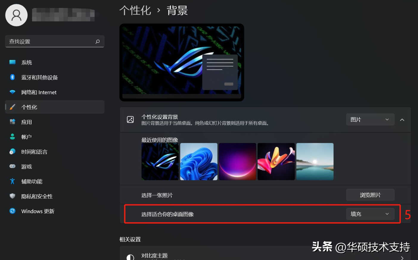 3, 如果想要变更图片显示在背景的方式,您可以在选择适合桌面图像的大小中选取填满、全屏幕、延展、并排、置中或跨屏幕⑤。
