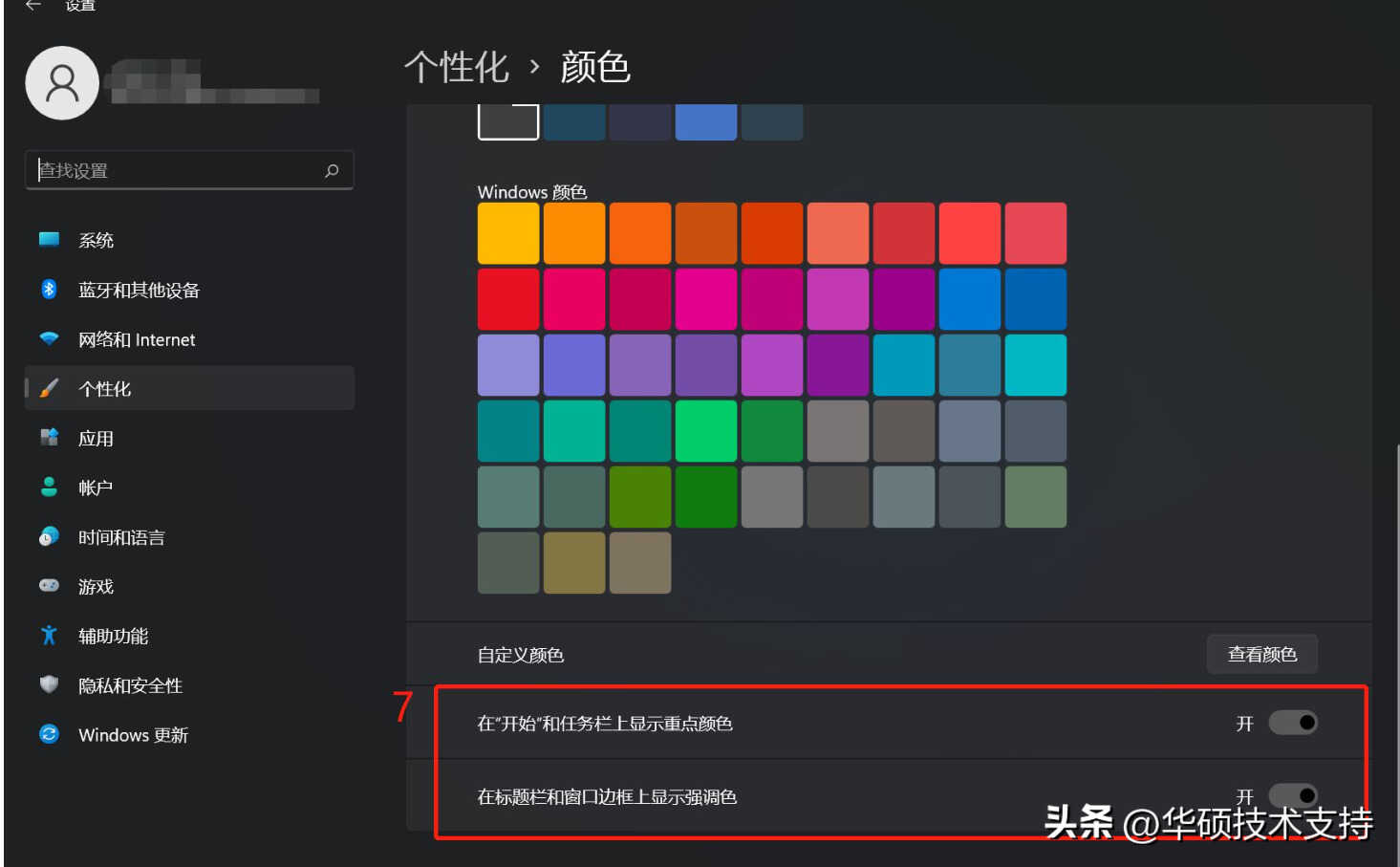 4, 向下滚动后,您可以再选择要显示主题色的区域⑦。(开始菜单和任务栏的辅色仅有在色彩设定为深色时才可做开启)