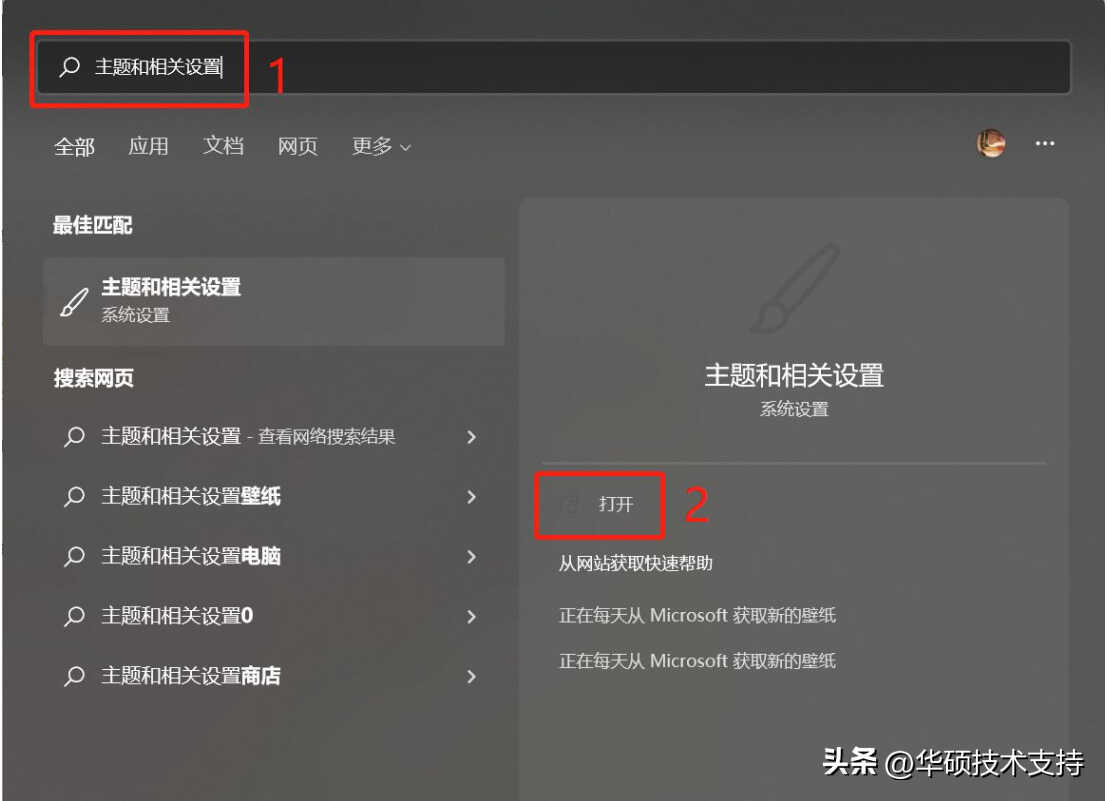 1, 在Windows搜索栏输入[主题和相关设置]①,然后点选[打开]②。