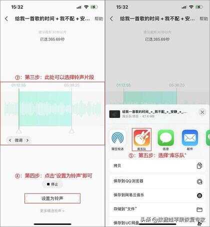 步骤2:选取好片段后点击【设置为铃声】,在弹出的新界面中选择【库乐队】即可;