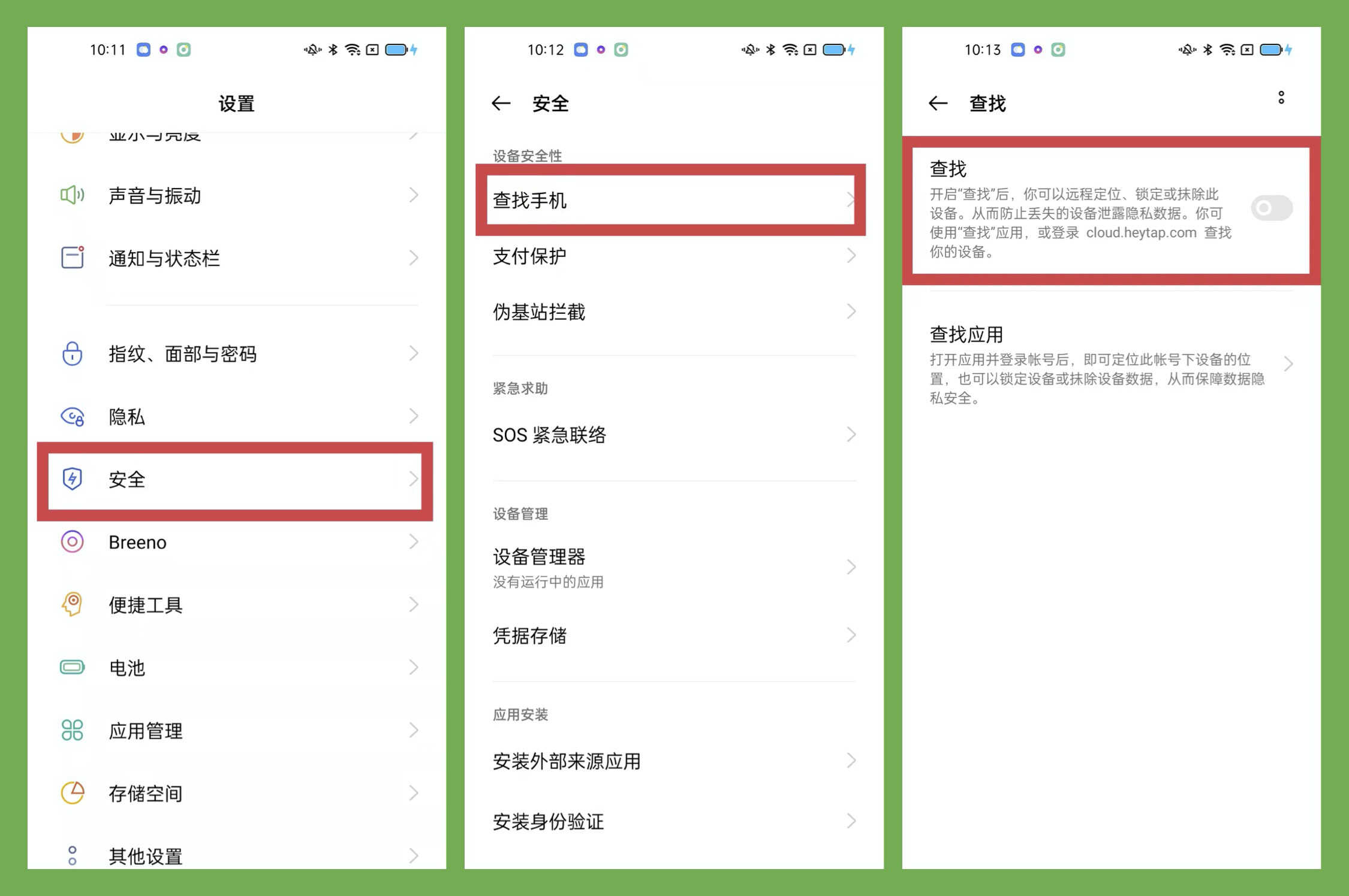 具体来说,我们可以打开OPPO手机的【设置】-【安全】-【查找手机】-【打开查找】。开启这一功能之后,我们可以对手机进行远程定位、锁定或抹除数据,从而防止丢失手机的设备泄露隐私数据。换句话说,一旦手机丢失,我们可以第一时间通过另一部手机锁定原来的手机,远程抹除数据,先保障信息安全,随后再通过位置锁定找回手机。