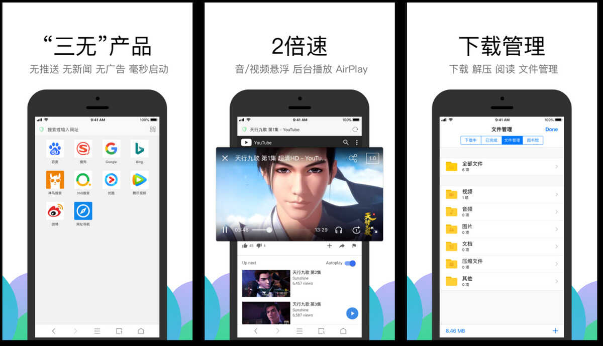 这是一款界面非常简洁的浏览器,没有推送、没有新闻、没有广告,拥有过滤广告的功能,看起来浏览器更简洁,而且内置播放器,可以实现弹窗播放视频、后台播放视频等。