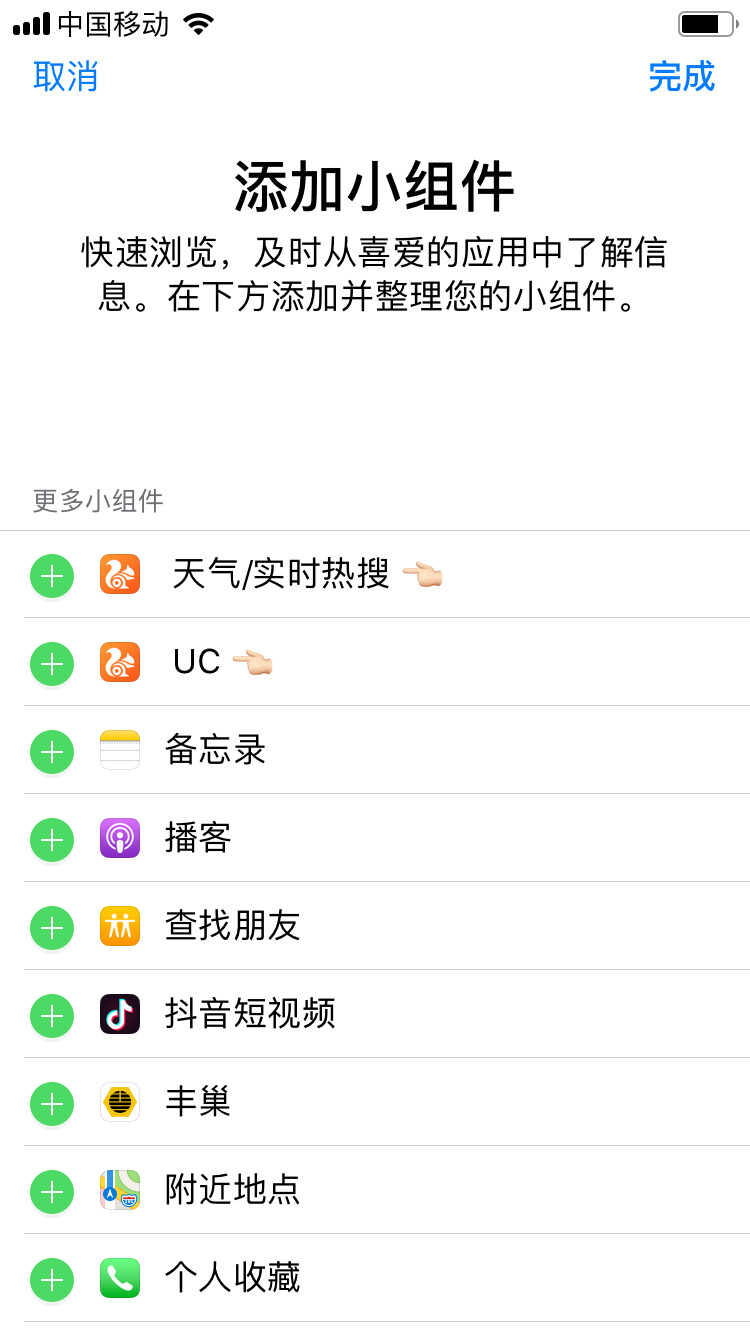 比如我的 iPhone 6 重置系统后,刚开始也找不到电池小部件,如下图所示: