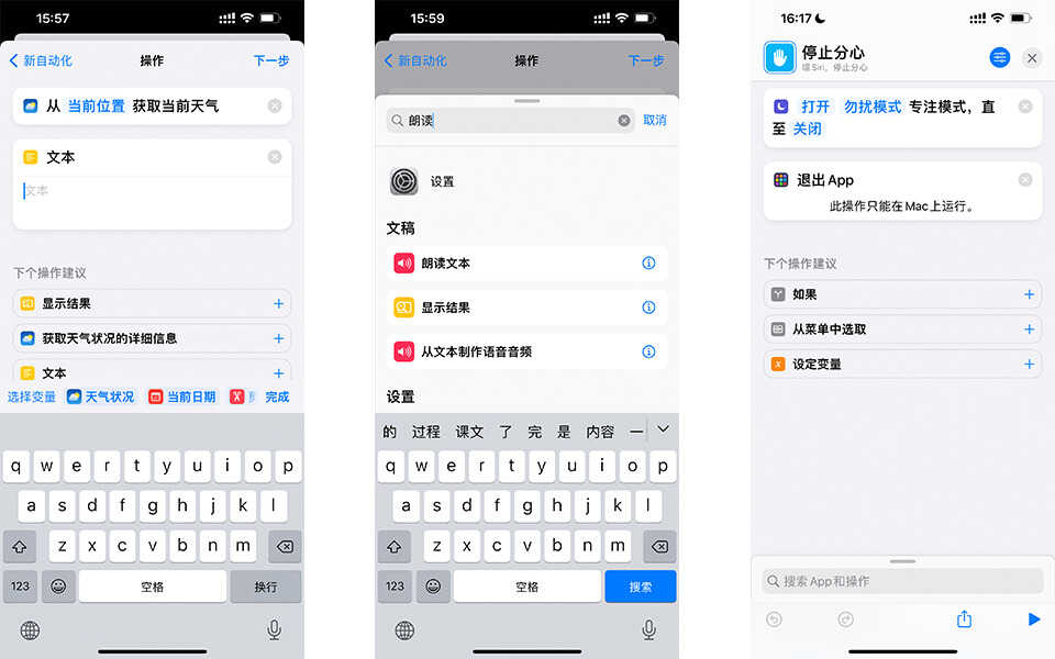 快捷指令第三个菜单,里面都是一些常用且已经设置好的功能,只需要选择就可以添加进去。比如停止分心,就是免打扰功能,开启后一些通知都会被关闭。因为只需要选择,没有什么技术含量,就不做详细介绍了。