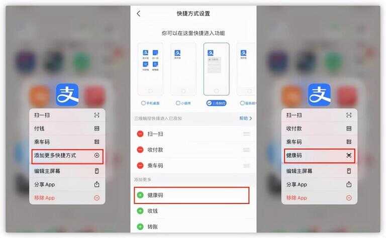 再新增个知识点吧,既然聊到了快捷方式打开健康码,还有几种方式可以做到这一个效果。第一,长按支付宝图标,就会出现扫一扫,收付款等快捷方式,之前没有设置过的话是没有健康码选项的,但是有个添加更多快捷方式的选项,点击进去后就有很多功能可供添加。找到健康码选择,退出app,长按就会有了。还有一种方式,找到健康码,进入健康码界面,右上角三个点后会有添加到桌面选项,跳转到safer浏览器,点击中间分享按钮,有添加到主屏幕选项,点击添加,然后桌面就会出现健康码的图标,在使用的时候就可以点击图标跳转到健康码界面。同理,其他软件或者功能也可以使用这种方式直接添加到桌面上来,调起之后直接就到对应的功能页面了。