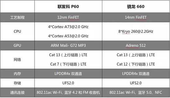 从参数上看,联发科P60最大的优势在于其工艺制程相对于骁龙660更加先进,借此P60在功耗与性能之间能够取得更好地平衡。但是CPU核心性能方面,虽然联发科终于在P系列处理器中加入了A73大核,但由于骁龙660采用了高通自主Kryo 260架构(阉割版的A73),再加上其在核心频率有0.2GHz的优势,所以CPU的性能方面,骁龙660应该会胜过P60。GPU方面,公版ARM架构的Mali- G72 MP3在整体的性能表现方面和Adreno 512有着一定的差距。其他的诸如网络支持方面,骁龙660都要略强于P60。