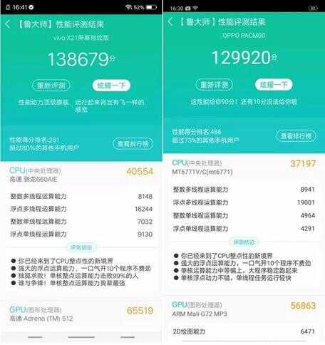 鲁大师的跑分情况大致和安兔兔相当,骁龙660拿出了13.8万的成绩,而联发科P60的得分也在13万左右。特别是从鲁大师的跑分结果中可以看到,骁龙660的GPU得分大幅领先,这也和之前3DMARK的跑分结果相吻合。