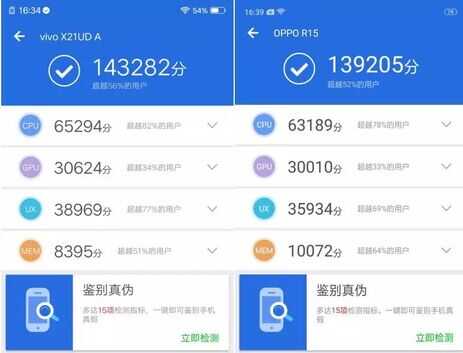 这是国内用户比较熟悉的两个性能测试软件,都是测试手机的综合性能表现,特别是在同级别机型的横向对比方面,具有不错的参考意义。首先是安兔兔,搭载了骁龙660的某旗舰跑出了14.3万分的成绩,无愧于神U之名。搭载了P60的OPPO R15稍稍落后,得分在14万左右。