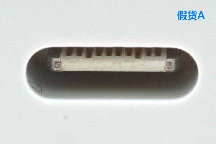 这是假货 A 的 USB-C 接口微距图,母座物料跟苹果正品完全不同,一眼就能看出是假货。