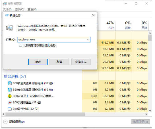 3.键入explorer.exe,点击清晰,耐心等待系统重启即可正常启动。