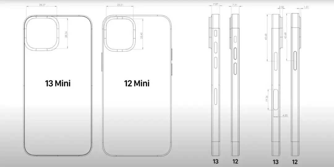 iPhone 13 mini 的镜头模组也变大了一些,从原本的宽高 25.21mm × 28.40mm 增加到 28.27mm × 28.26mm,iPhone 13 mini 的镜头模组尺寸比起 iPhone 13 Pro Max 来说还是要更小些。