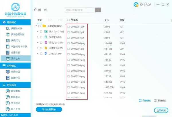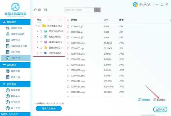 3.扫描完成后,你会发现文件名是以数字形式呈现的,这是因为深度扫描后是根据文件数据结构进行扫描排序,会把文件随机重命名。这时我们可以通过文件类型、文件大小查看下是否有自己想要的数据。
