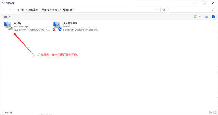 2. 右键单击本地连接,选择禁用,接着右键单击开启。