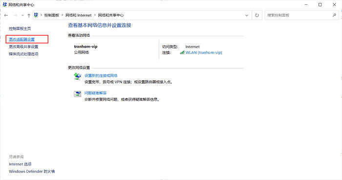 2. 依次单击网络和Internet、网络和共享中心,单击左侧的更改适配器设置。