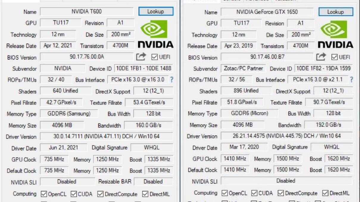 丽台T600和GTX1650一样采用的是TU117核心,但是相比GTX1650少了250个CUDA核心,频率也更低。