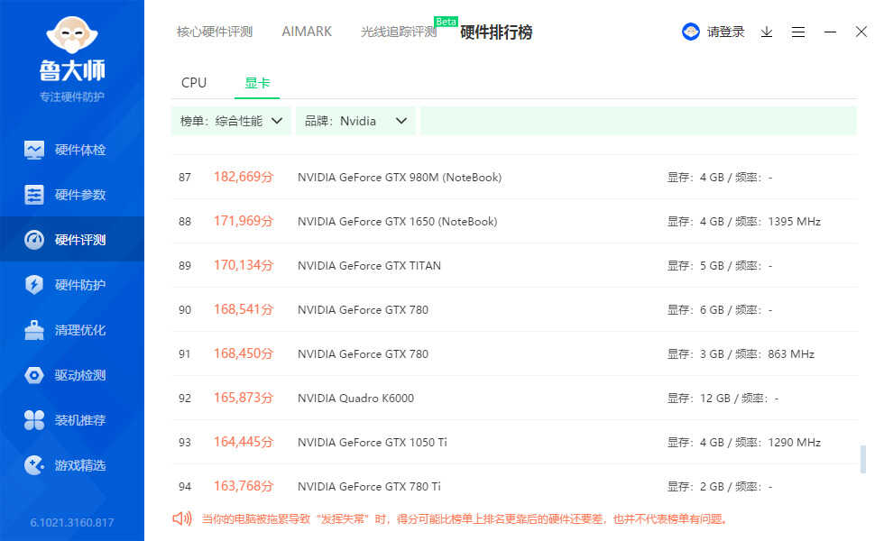 参考鲁大师的分数排行,大概看出,T600性能比GTX1050TI稍微强点。