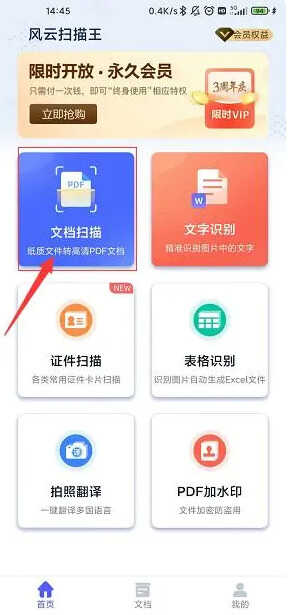 1、打开手机,在应用市场里输入风云扫描王这款软件快速安装下来,直接点击打开进入软件。软件的主界面提供了各种各样的功能可以使用,找到【文档扫描】直接点开。