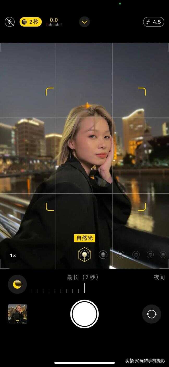 iPhone「夜间模式」会识别手机的稳定情况,所以如果你想获得更长的爆光时间,建议将手机固定在三脚架上面,这样能获得最高30s的爆光时间。