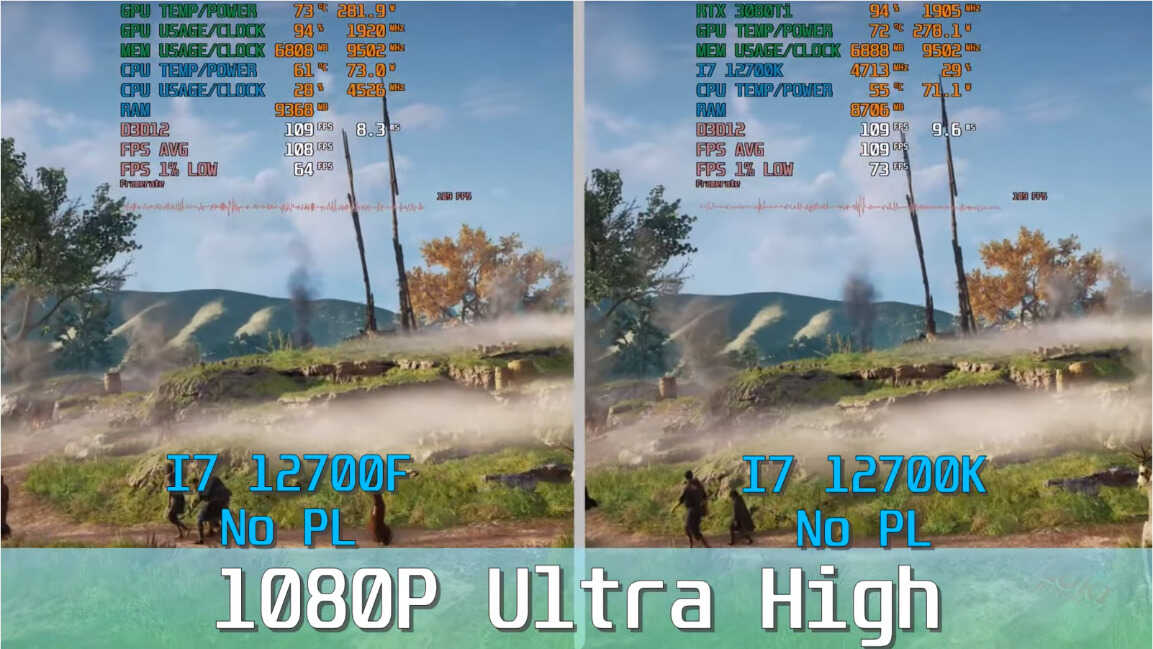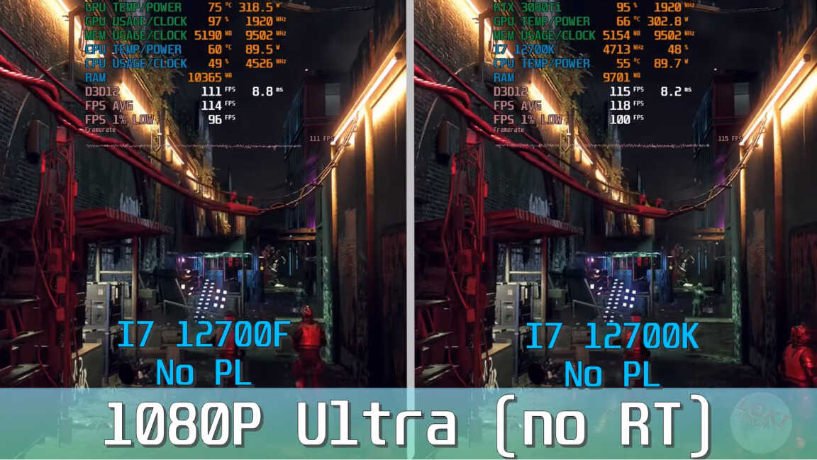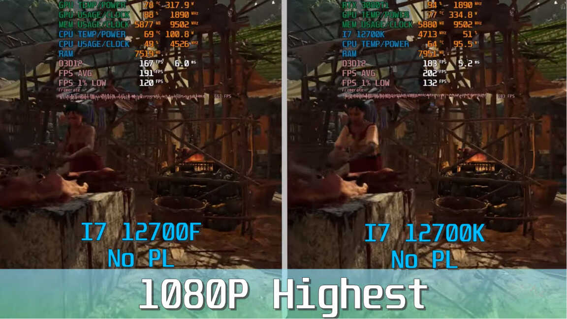 在以上三款游戏测试中,两款cpu都在bios解除了功耗的限制。12700f全核4.5GHz,12700kf全核4.7GHz。12700f的内存频率在3200MHz,12700kf内存频率为3600MHz。在这三款3A游戏中,12700kf平均帧数领先3.87%。这里的差距依然不大,和生产力对比结果一样,如果需要进一步拉大差距,则必须超频。