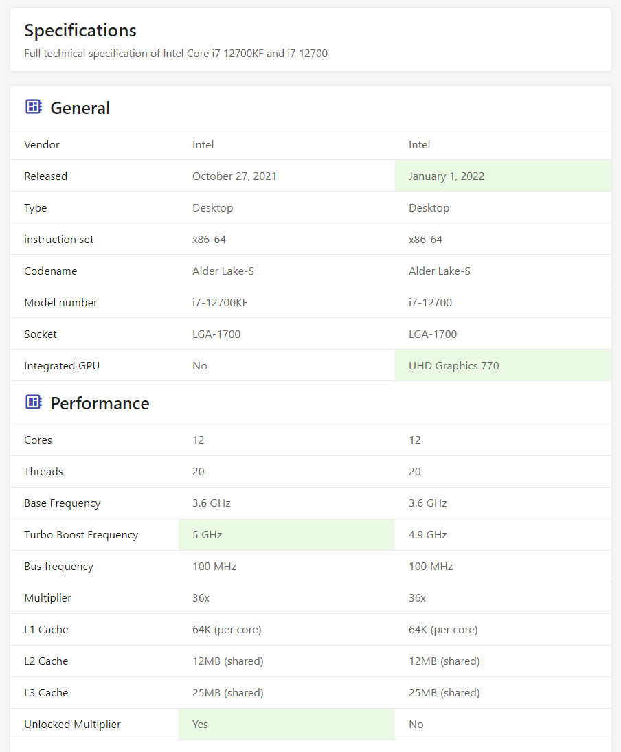 5.12700kf全核4.7GHz,12700f全核4.5GHz