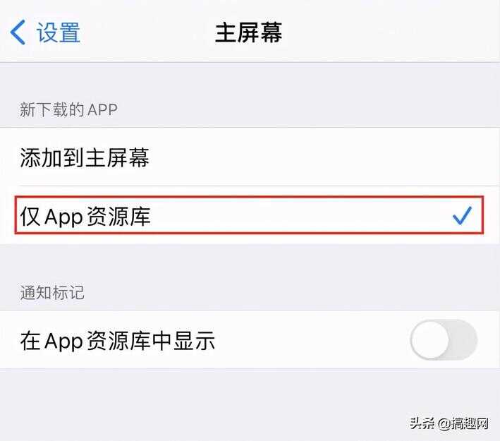 方法如下:打开 iPhone 设置-主屏幕,在“新下载的 App”选项中,勾选“仅 App 资源库”即可。