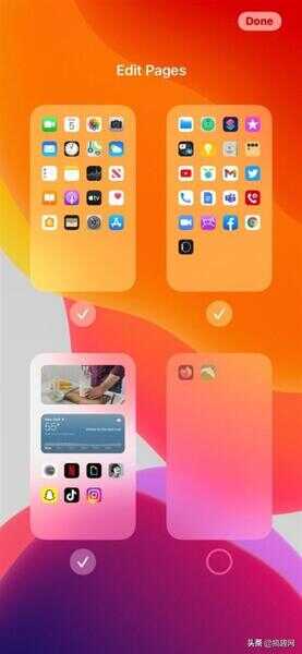 3. 现在您可以看到所有页面的缩略图(除了资源库和今日视图)。每个可见的屏幕下面都有一个复选标记,取消勾选任何你想隐藏的屏幕,然后点击右上角的 "完成"进行保存即可。