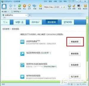 5.单击更改密码将自动打开。浏览器跳转到QQ安全中心的“修改密码”页面,单击QQ安全中心页面的“快速更改”按钮。