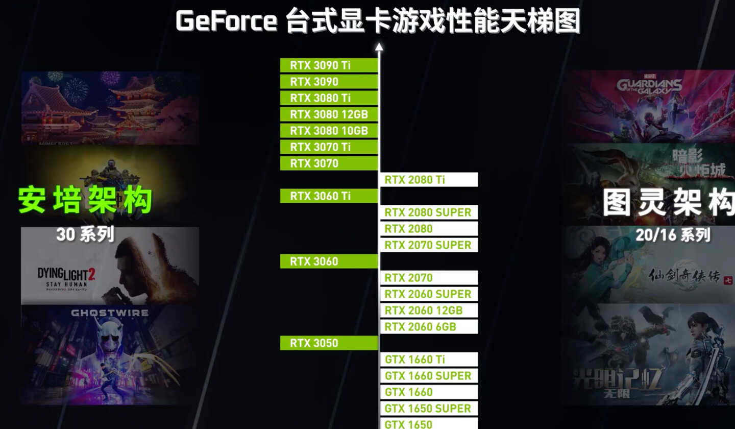 如下图所示,英伟达展示了图灵架构和安培架构两代显卡的性能排行榜,包括 GTX 1650 到 RTX 3090 Ti 共 23 款显卡。