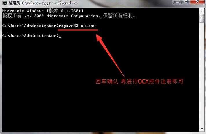 3、输入“regsvr32 xx.ocx”按回车,重新进行OCX控件注册,如下图所示: