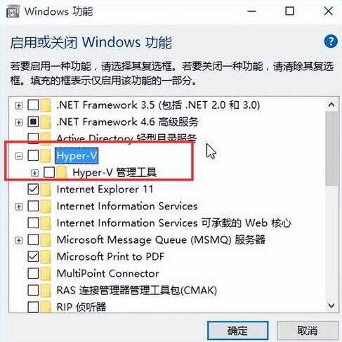 3、取消勾选Hyper-V,点击确定按钮,如下图所示: