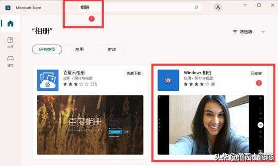 1、打开微软应用商店,搜索相册,搜索结果如下,找到windows相机,点击: