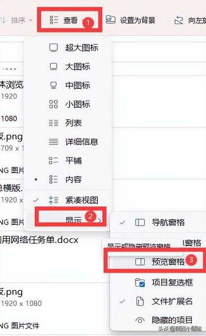 2、在查看的下拉选项里,找到最下方的显示选项,子菜单再勾选【预览窗格】: