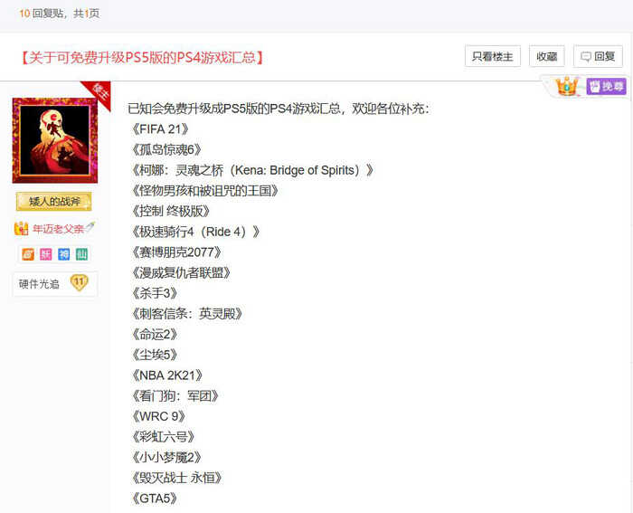 如果你购买了一些PS4游戏的话,放在PS5上运行还能获得升级到PS5版的权益,是免费升级,还是以折扣价购买数字版的形式,具体如何,由游戏的开发商决定。目前可升级的游戏,笔者找到了网友的整理的资料,各位可以看下。
