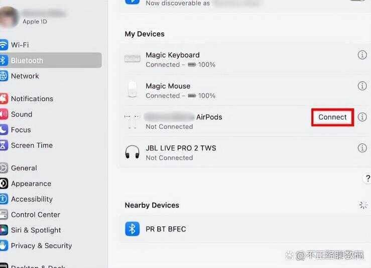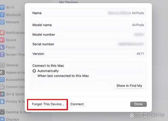 在 Mac 上,前往“系统设置”>“蓝牙”。单击 AirPods 旁边的“i”,然后选择“忘记此设备”。
