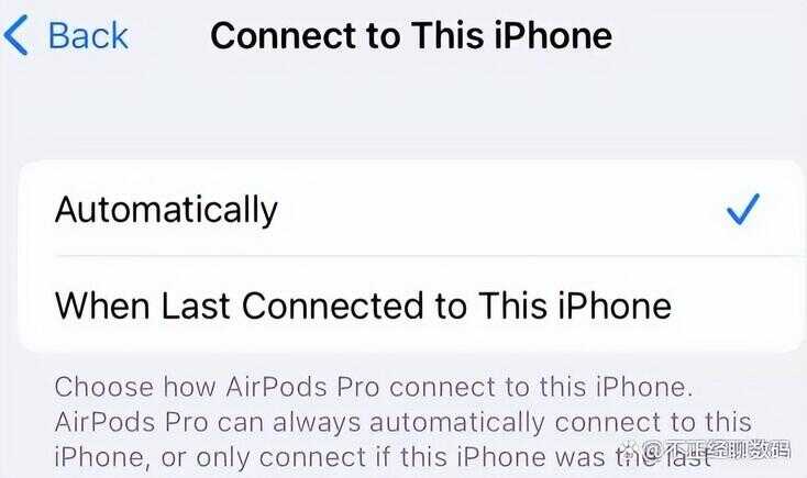 在 iPhone 或 iPad 上,前往“设置”>“蓝牙”,然后点击 AirPods 旁边的“i”按钮。在“连接到此 iPhone/iPad”下,选择“上次连接到此 iPhone 的时间”以禁用自动切换。