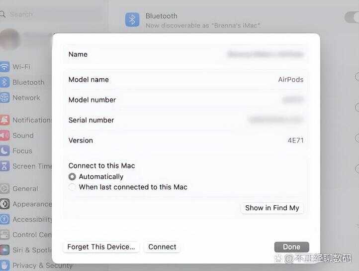 在 Mac 上,您会在“系统设置”>“蓝牙”下找到相同的选项,方法是单击 AirPods 旁边的“i”并将“自动”更改为“上次连接到此 Mac 时”。