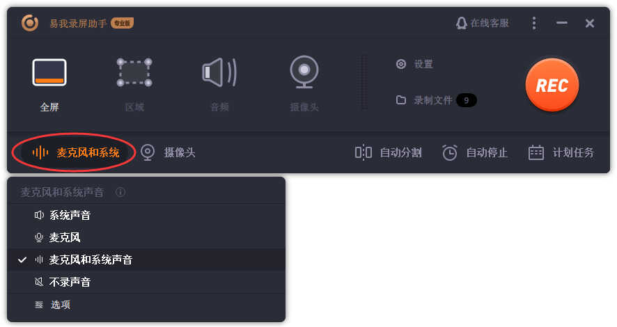 步骤三:根据录制要求选择声音类型,【系统声音】、【麦克风】、【系统声音和麦克风】或【不录声音】,点击【选项】,可以分别调节系统和麦克风的音量大小。