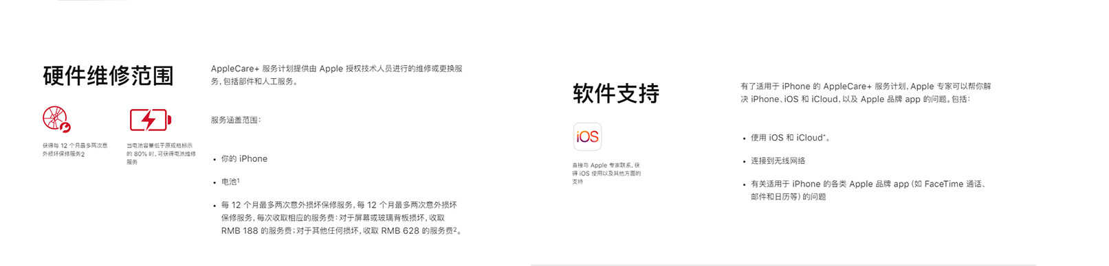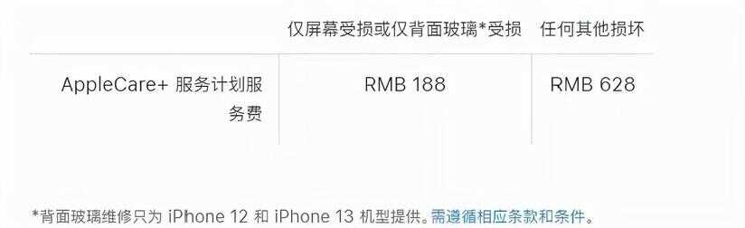 对于屏幕或玻璃背板(玻璃背板仅限 iPhone 12 和 iPhone 13 机型)的损坏会收取 188 元的服务费;对于其他任何损坏,将收取 628 元的服务费。