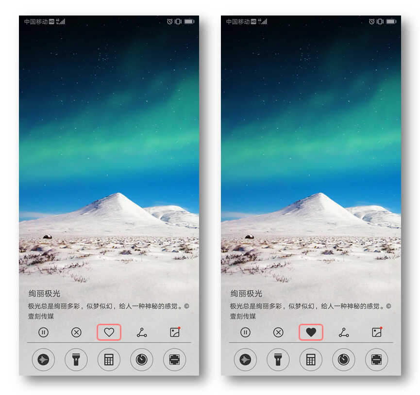 锁屏界面底部向上拉 – 点击收藏按钮(中间的心形图标,收藏后空心变实心)