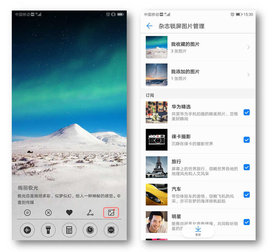 锁屏界面上拉后,点击最右边的 “杂志锁屏图片管理”图标,可以看到自己收藏的图片,也可以订阅自己喜欢的图片类型 / 取消不喜欢的类型。