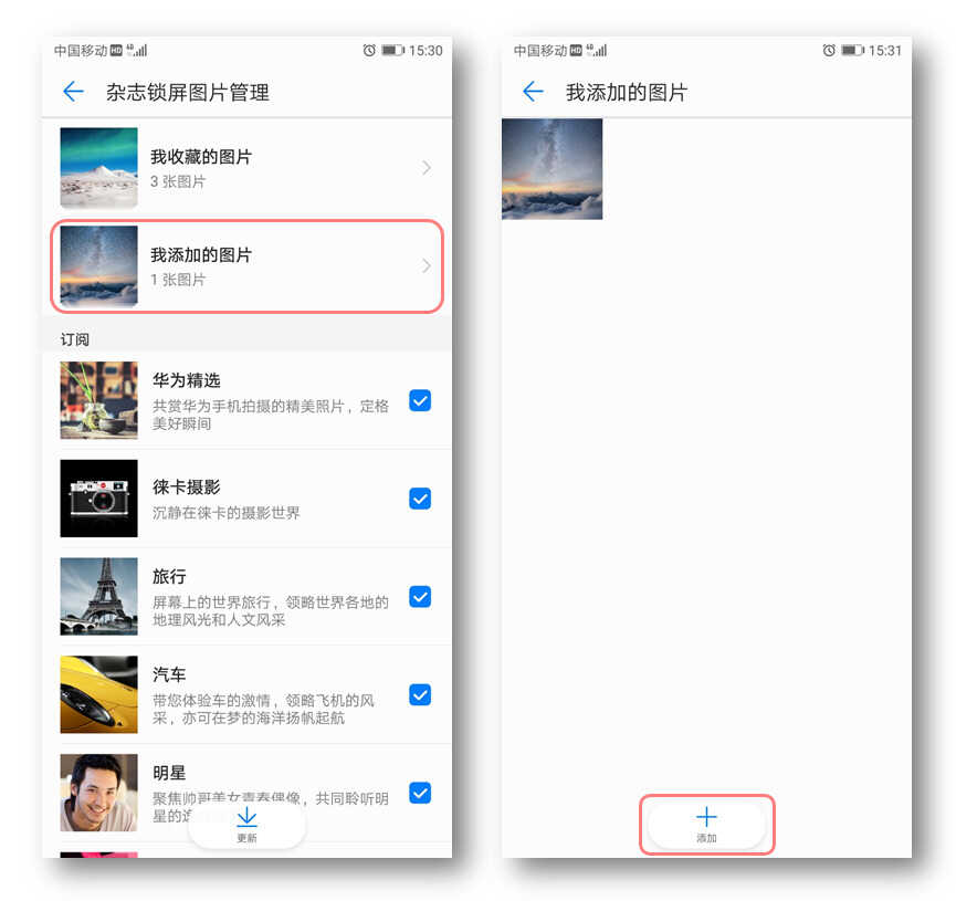 点击“我添加的图片” – “添加”,即可自定义喜欢的图片到杂志锁屏了,之后在不断切换的锁屏壁纸中,粉粉便可以看到自己添加的壁纸了哦~